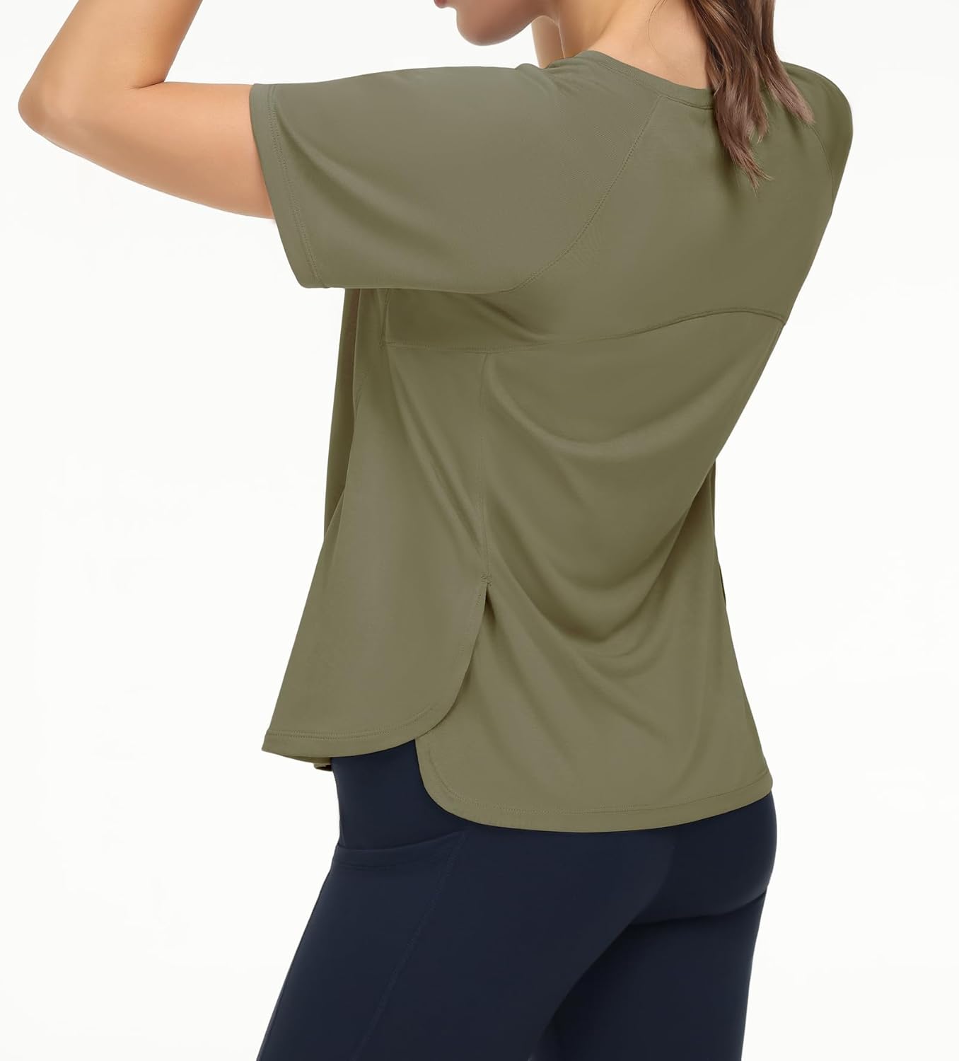 - Classic round neck and raglan sleeve. The classic round neck design of the exercise t-shirts for women lets you enjoy sports without restraint, and the raglan sleeve makes for a comfy fit to your arm.